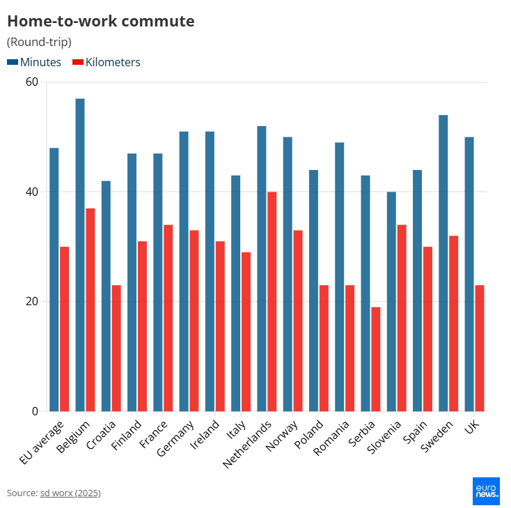 Σύμφωνα με το euronews, η έρευνα επισημαίνει επίσης ποιες ευρωπαϊκές χώρες έχουν τα υψηλότερα ποσοστά των λεγόμενων «υπερ-μετακινούμενων» (super commuters), εργαζομένων που περνούν περισσότερο από 90 λεπτά την ημέρα στις μετακινήσεις.